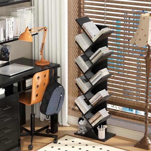 10 Tier Tree Book Shelf, Floor Standing Wood Bookshelf for Narrow Space, Storage Organizer Bookshelves for Books/CDs/Magazine, Bookcase with Shelves for Home Office, Living Room – Black