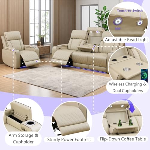 Leather Power Recliner Sofa Set, Living Room Furniture Sets, 2 Piece Reclining Sofa & Chair Set with Cup Holders, Breathing Leather Recliner Couches with Coffee Table for Home/Office, Khaki